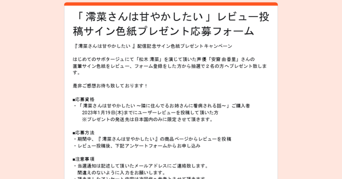 (2)レビュー投稿後、下記アンケートフォームからお申し込み 「 澪菜さんは甘やかしたい 」レビュー投稿サイン色紙プレゼント応募フォーム『 澪菜さんは甘やかしたい 』配信記念サイン色紙プレゼントキャンペーンはじめてのサボタージュにて「松木 澪菜」を演じて頂いた声優「安齋 由香里」さんの直筆サイン色紙をレビュー、フォーム登録をした方から抽選で2名の方へプレゼント致します。是非...※2023年1月19日(木)23:59まで受付