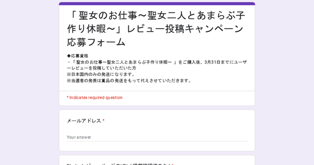 「 聖女のお仕事~聖女二人とあまらぶ子作り休暇~」レビュー投稿キャンペーン応募フォーム◆応募資格・「 聖女のお仕事~聖女二人とあまらぶ子作り休暇~ 」をご購入後、3月31日までにユーザーレビューを投稿していただいた方※日本国内のみの発送になります。※当選者の発表は賞品の発送をもって代えさせていただきます。※発送は日本国内のみの対応となります。