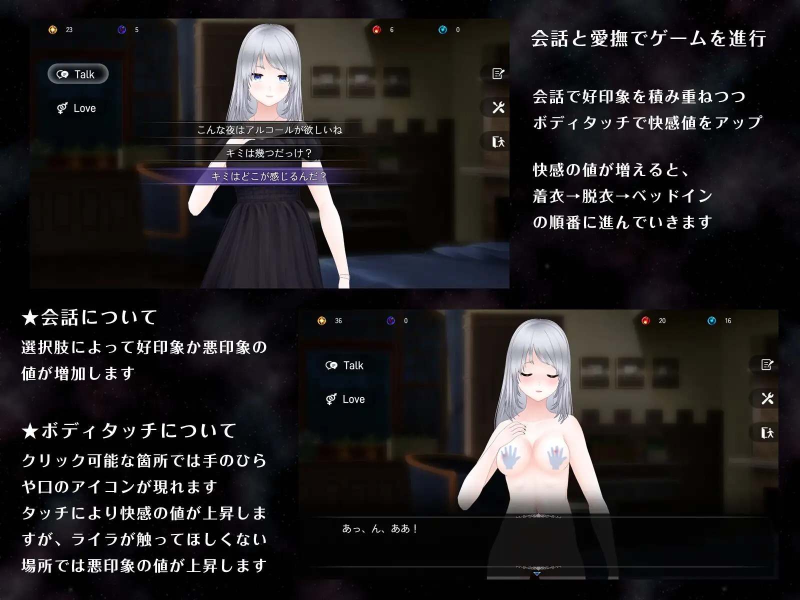 タッチにより快感の値が上昇しますが、ライラが触ってほしくない場所では悪印象の値が上昇します