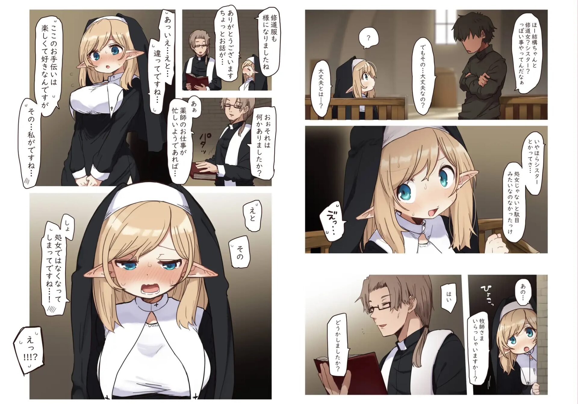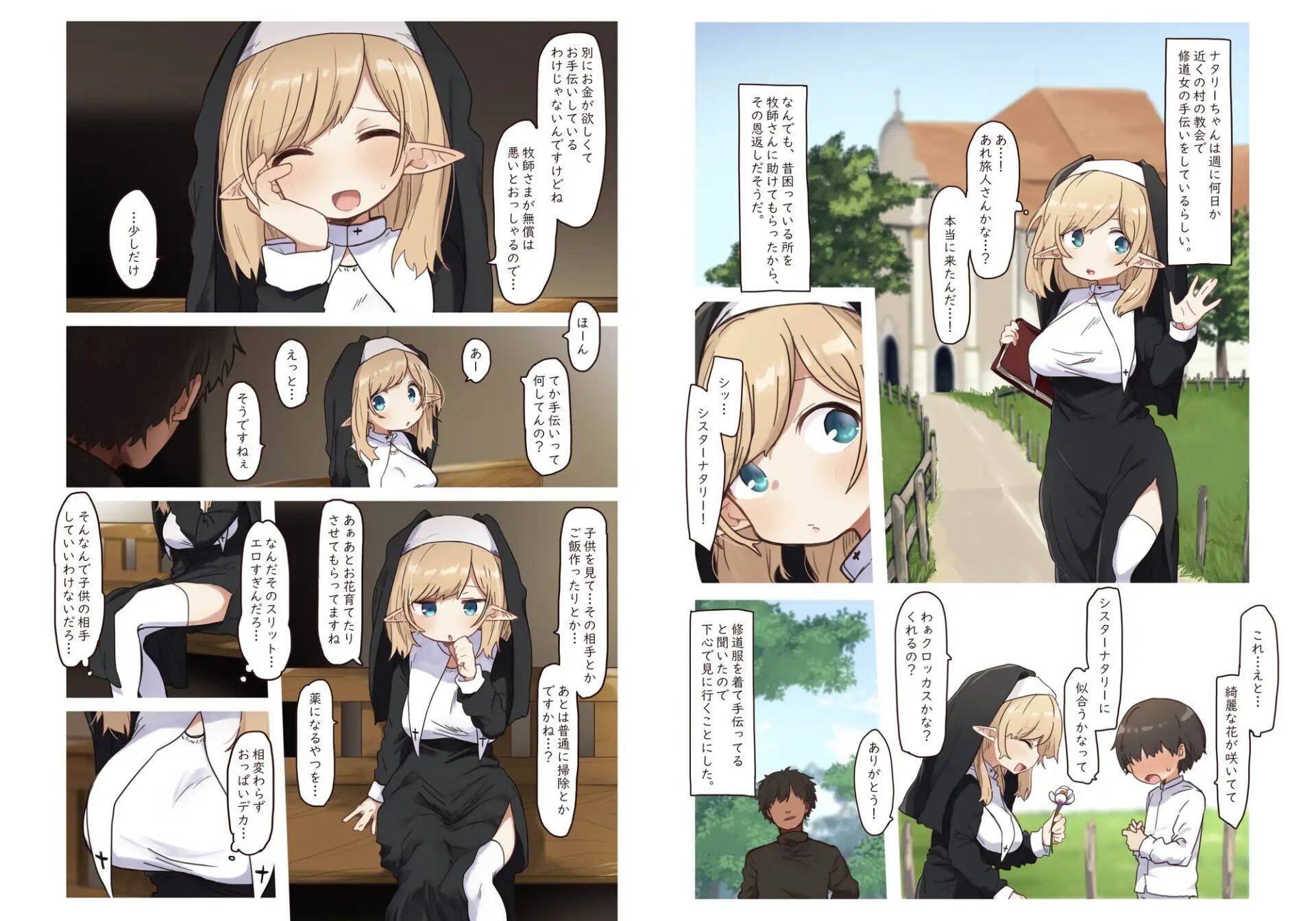 エルフの修道女。 / いーすとはうす マンガ X Bluesky Misskey Facebook はてブ LINE 2025.02.26 マンガ いーすとはうす エルフの修道女。 五作目「エルフの修道女。」 教会のお手伝いをしているナタリーちゃんの修道服を見るため、遊びにきた旅人。 休憩の合間に我慢できなくなりそのままえっちし始めてしまう。 新作の媚薬ローションを使って楽しんでいたところに…!? フルカラー漫画 全47P(本文44P) 一作目「エルフの住む森。」 森で中で人間の男に遭遇したエルフのナタリーは、油断してしまい媚薬を飲まされてしまう。そのまま男の好きにされてしまう…。 媚薬の効果で発情してしまったナタリーちゃんは自ら求めるようになってしまい…!? フルカラー漫画 全38P(本文36P) 二作目「エルフと行く街。」 盛られた媚薬の解毒剤をもらうために洞窟へ行くナタリーちゃん。解毒剤の材料がないとのことで街まで同行する事に。 デートのような雰囲気に油断したナタリーちゃんはお酒で簡単にお持ち帰りされてしまい…!? フルカラー漫画 全38P(本文36P) 三作目「エルフが住む家。」 久しぶりに森の中で旅人と再会するナタリーちゃん。道具を貸して欲しいという旅人さんを家に招く事に。 つい期待してしまっていたナタリーちゃんに応えるためエッチな事をしている最中、裏で妹が覗いている事に気づいた旅人がとった行動は…!? フルカラー漫画 全43P(本文40P) 四作目「エルフの姉妹達。」 ナタリーちゃんの薬師の仕事を手伝っているうちに、旅人は家で寝泊まりするようになっていた。 しかし、妹と同居している事もありこっそりしてばかりだったナタリーちゃんは、媚薬えっちへの欲望が抑えられなくなっていた。 旅人に媚薬に盛るはずが、誤って妹が飲んでしまう。 旅人と妹がえっちしている現場に出くわしたナタリーちゃんはそのまま3人で…!? フルカラー漫画 全50P(本文46P)