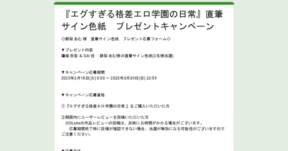 以下の応募フォームにご入力の上、送信をお願い致します。 『エグすぎる格差エロ学園の日常』直筆サイン色紙 プレゼントキャンペーン◇餅梨 あむ 様 直筆サイン色紙 プレゼント応募フォーム◇▼プレゼント内容鷹峰 杏奈 & SAI 役 餅梨 あむ様の直筆サイン色紙(2名様当選)▼キャンペーン応募期間2025年3月18日(火) 0:00 ~ 2025年3月30日(日) 2...キャンペーン応募期間終了後、当選者の方へ当選メールをお送りいたします。