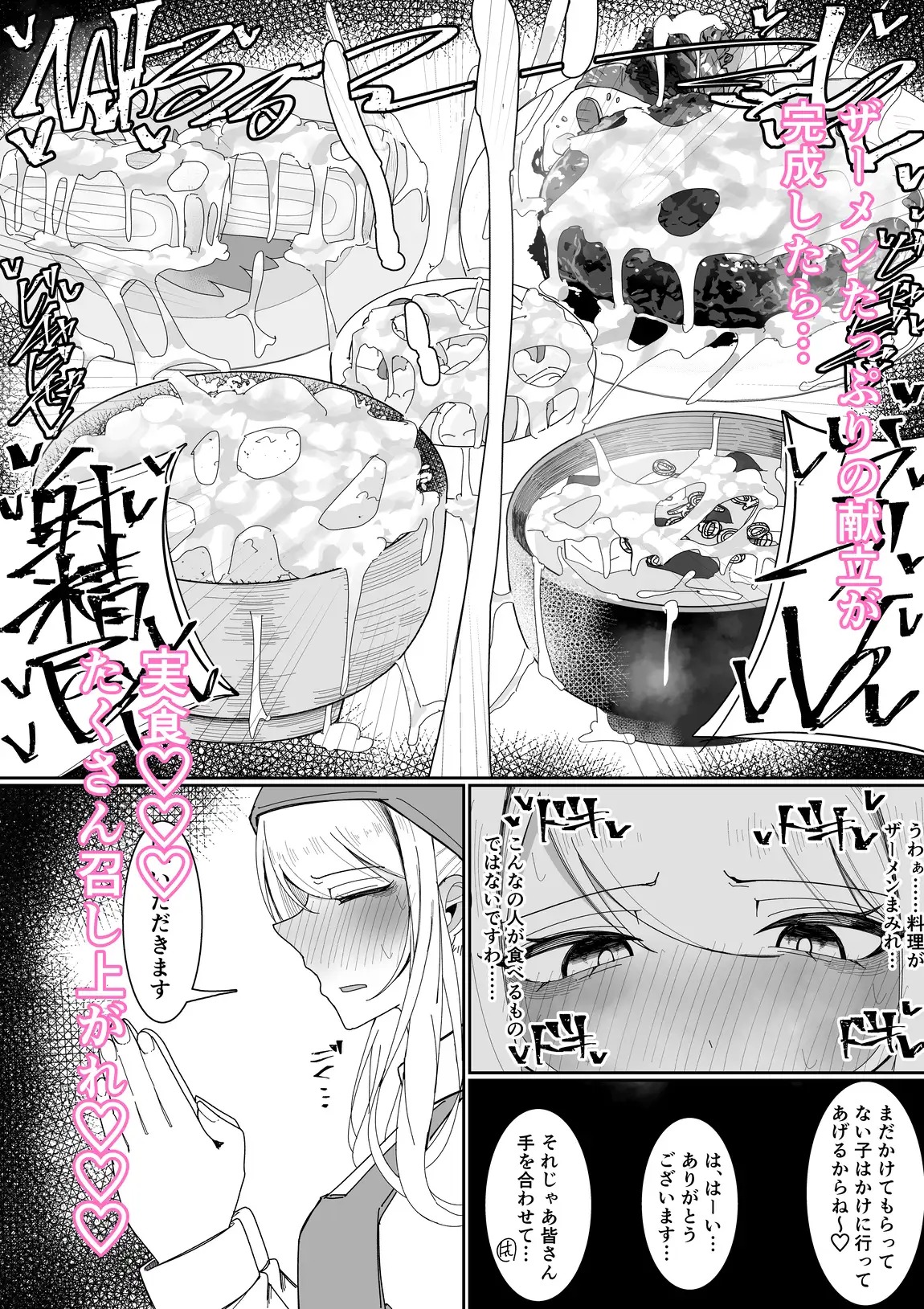 チンカスとザーメンを味噌と一緒に溶き入れた味噌汁、潰したジャガイモやきゅうりなどとザーメンをぐちゃぐちゃにかき混ぜたポテトサラダ、精液が染み出すほどジューシーな卵焼き、特製ザーメンソースがたっぷりかかったハンバーグなどを調理…………