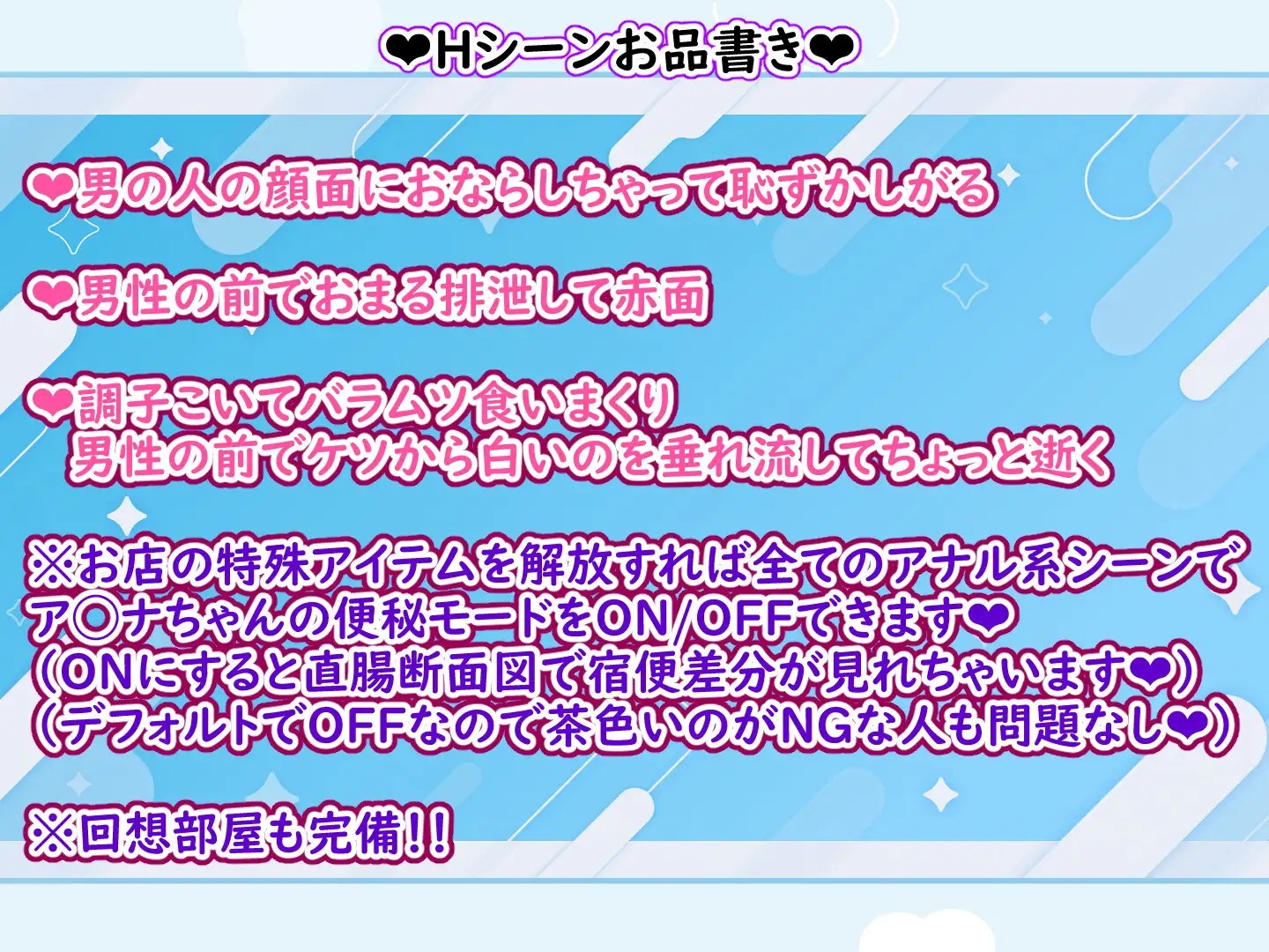 ・スカが好きな方向けにお店の特殊アイテム解放で全てのアナル系シーンにて宿便差分を選ぶことができます