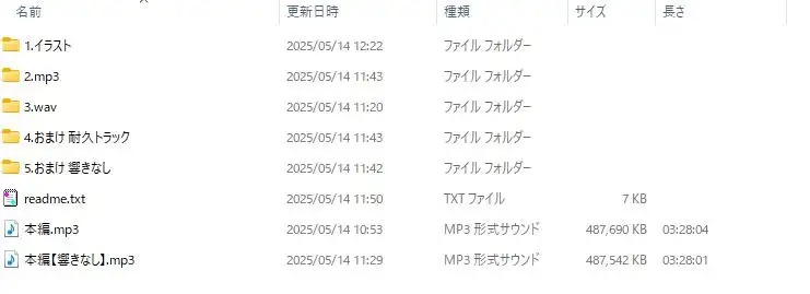 ようこそ、くらやみ洞窟へ!(耳かき60分)1時間7分42秒 人生まっくら、洞窟まっくら!(耳マッサージ30分)31分56秒 洞窟で朝冷えますからヴォッカで体温を温めましょう!(ほろ酔い耳舐め&あまあま首舐め90分)1時間30分 次のデートも昏い場所でお願いします!(心音・吐息20分)18分6秒 本編3時間28分4秒 特典 ぐっぽり耳舐め耐久60分 (後日アップデートで追加予定)60分レビュー音読特典:アールさんがあなたのレビューをバイノーラルマイクで読み上げてくれます。