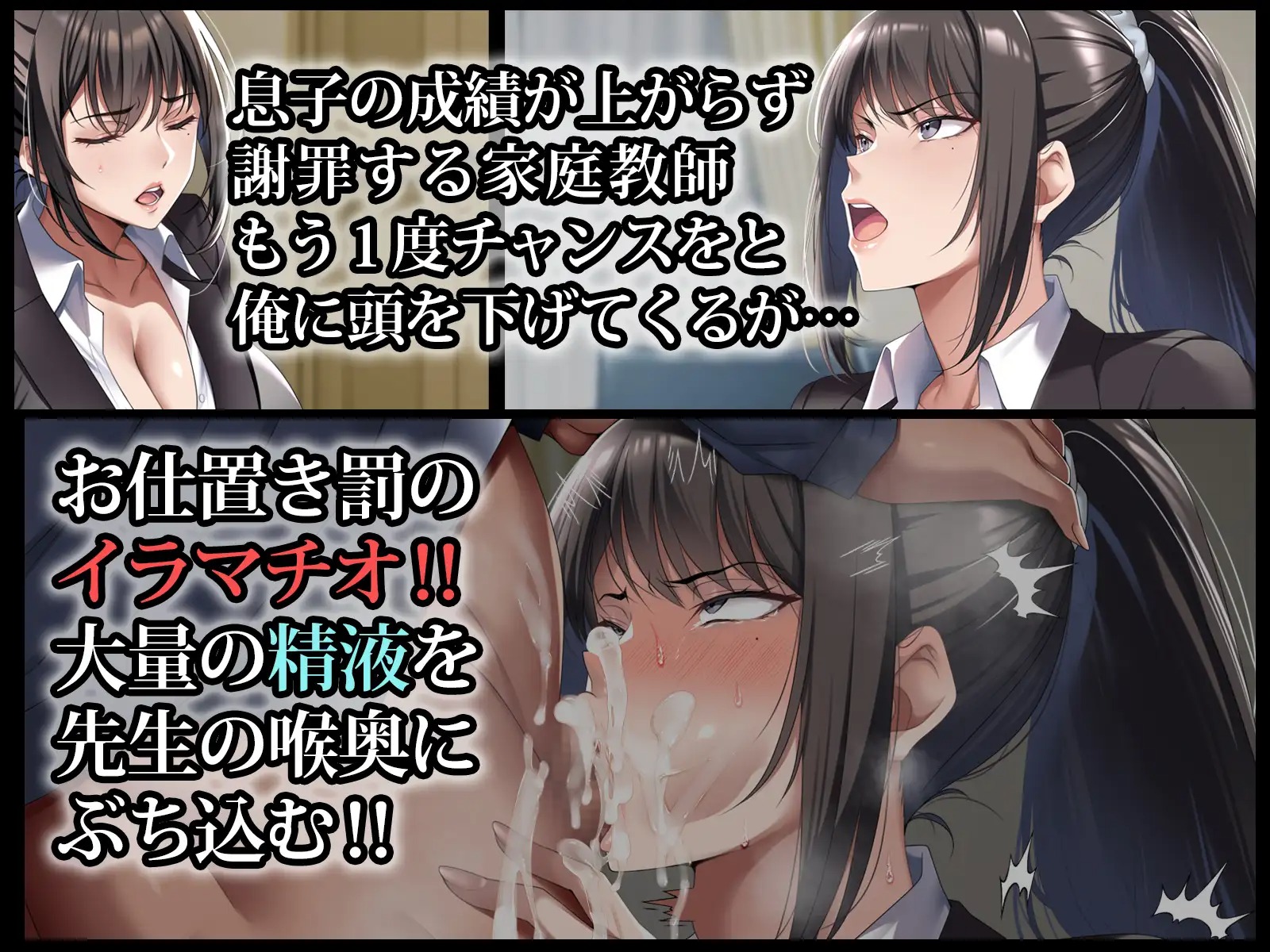 先生は喉を詰まらせないように夫じゃない男の精液を嫌々ながらも必死にごくごくと飲む。興奮してヤりすぎてしまい、このまま先生が息子の家庭教師を