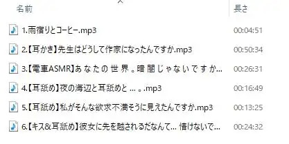 耳かき・耳舐め・ささやき・雨音・波音・電車音 などです。