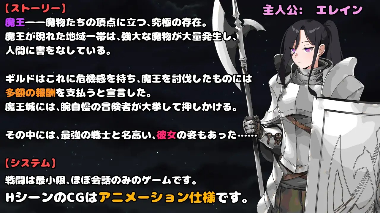 戦闘は最小限、ほぼ会話のみのゲームです。主人公である最強の女戦士エレインは、どんな魔物も一撃で倒すほどの