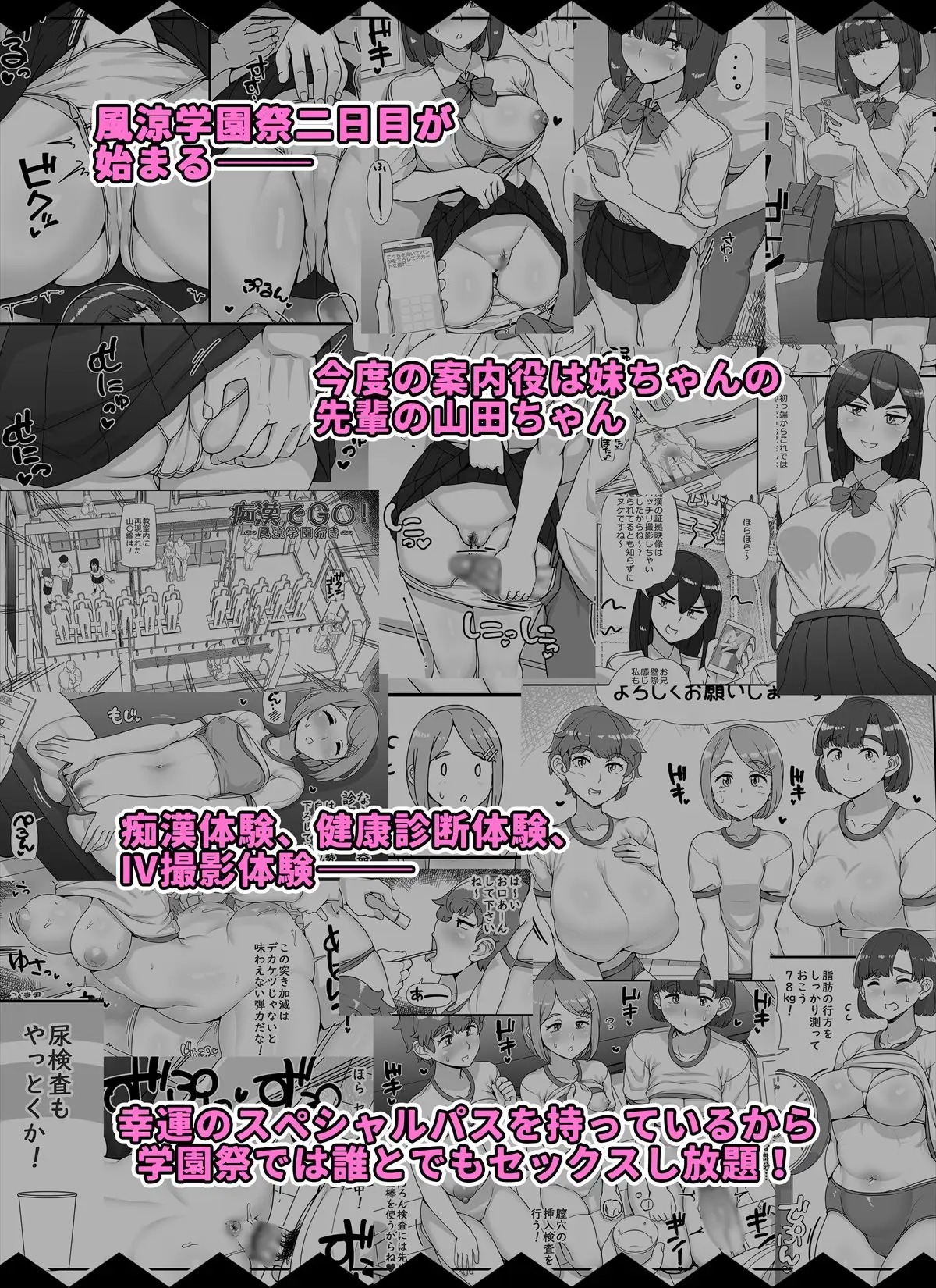 学園祭2日目が始まった!痴○プレイ、健康診断ごっこ、イメージビデオ撮影、夜はやっぱり女子寮にお泊り。誰とでもセックスできる幸運のスペシャルパスと共に学園祭は続く。本編50ページ(全54p)のデジタル同人漫画!