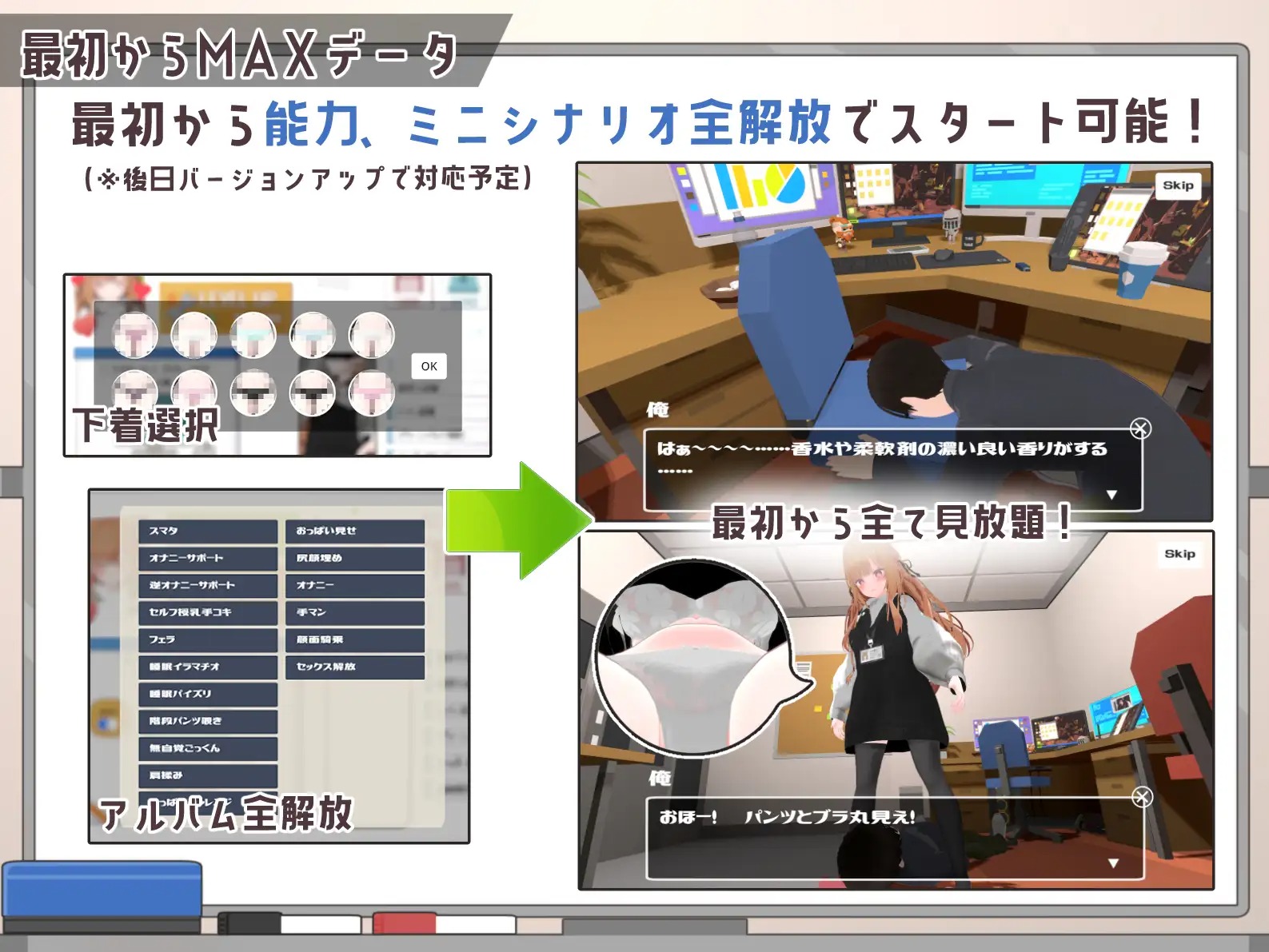 オフィス盗撮 〜気になる新人のあの子〜 / あすなろ工業 シミュレーション X Bluesky Misskey Facebook はてブ LINE 2025.10.10 シミュレーション あすなろ工業 オフィス盗撮 〜気になる新人のあの子〜 メインヒロイン 小木 莉々(おぎ りり) 小さなファッション雑誌の編集部に入社した新人。 高いルックスが買われてモデルとしても業務を行う事に。 明るく可愛く他の部署からも目がかかっている。 たまたま1人になっていた主人公の部署に配属され 主人公から盗撮&セクハラを受ける日々となる。 サブヒロイン 総務さん おっとり優しい口調で社内の隠れファンは多い。 見た目も良いのでたまに雑誌の撮影モデルになってくれる。 動画保存システム 本作の一番のポイント! ゲーム内で盗撮した動画は保存され、本人の目の前で何度も見返す事が可能! 更に仲良くなればセクハラ動画やハメ撮り動画も撮影可能!