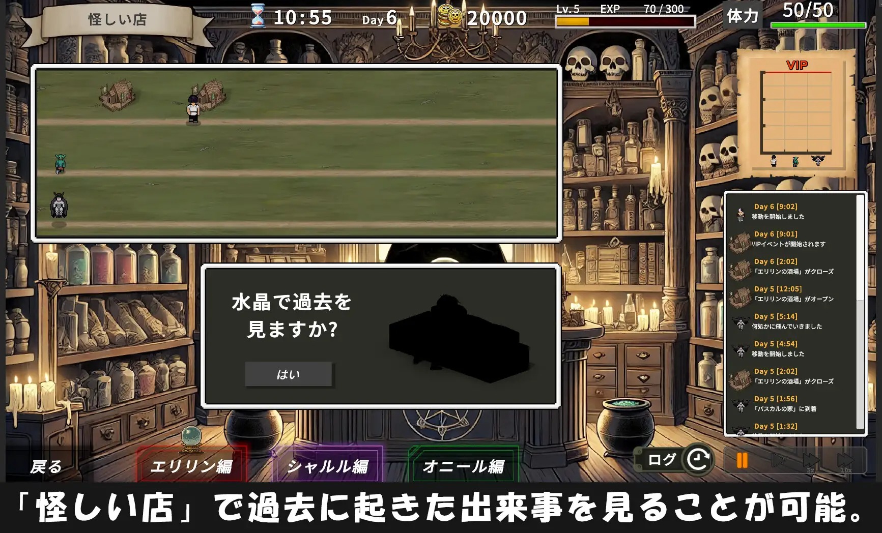 稼いだ資金で酒場「エリリンの店」に通い、VIPの権利を獲得することが本来の目的ですが…ライバル達もVIPを狙っています。