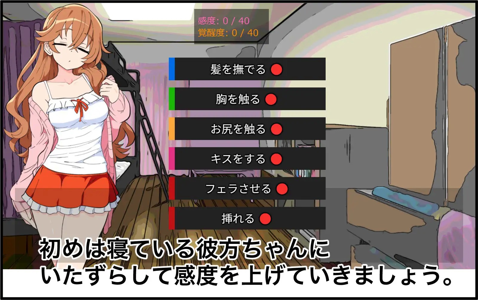 ゲーム中では、彼方ちゃんとの関係を深めるためにさまざまな行動を選ぶ場面があります。選んだ行動で親密度と覚醒度が変化し、高まるとより大胆な行動が可能になります。