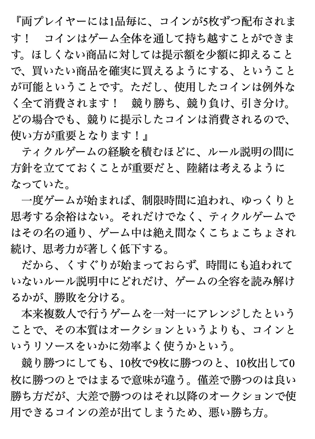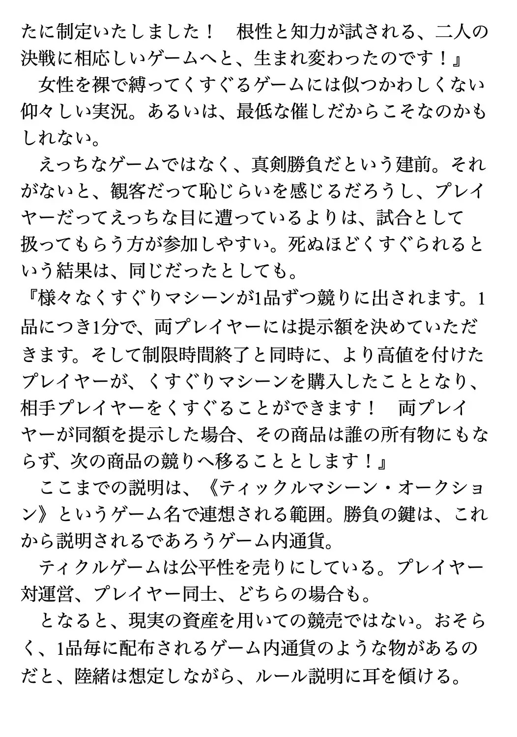 上記リンク、体験版、製品ファイルに同梱している《ティックル・アンド・リフレクト》と、電子書籍第一弾である《チョイス・ザ・ティックリッシュモメント》と登場人物が重なっているので、そちらを読んでいただいてからの方がより楽しめるかと思います。裏社会で行われている、敗者は12時間のくすぐり地獄に堕とされる、くすぐりを伴うゲームのプロプレイヤーである美少女、枯覇 忍舞(かれは しのぶ)の29回目のゲームでの奮闘を描いた本編約八万六千文字(作品紹介画像換算で181ページ)。ゲームの敗者に対するペナルティであるくすぐり地獄を書いたエピローグ約七万四千字(154ページ)。29回目のゲームを終えた後の忍舞の日常を書いたおまけパート『29度目の擽間』約一万二千字(26ページ)と、登場人物たちによるゲームのくすぐったさなどを評価したクロスレビューを収録しています。