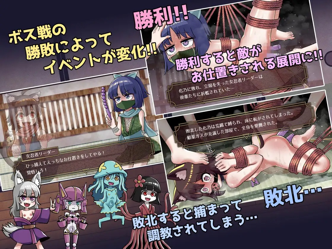 敵は女忍者、触手、植物、機械、モンスター娘などなど… ダメージを受けると服が脱げていき裸になってしまいます。