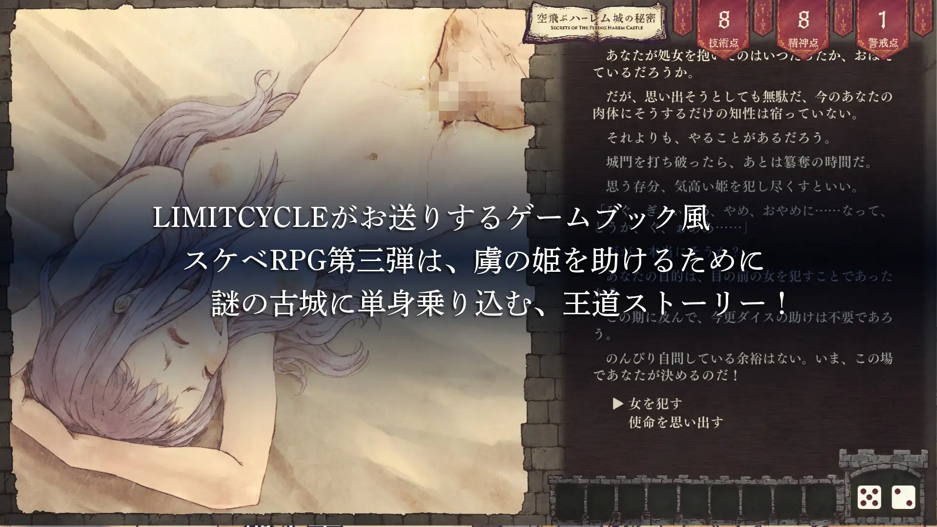 LIMITCYCLEがお送りするゲームブック風スケベRPG第三弾は、虜の姫を助けるために、謎の古城に単身乗り込む王道ストーリーです。