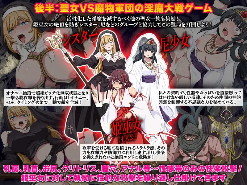 姫巫女の絶頂を防ぎシスター、尼などのグループと協力してこの難局を打開しよう!乳房、乳首、お尻、クリトリス、膣穴、アナル等…性感帯のみの快楽攻撃!