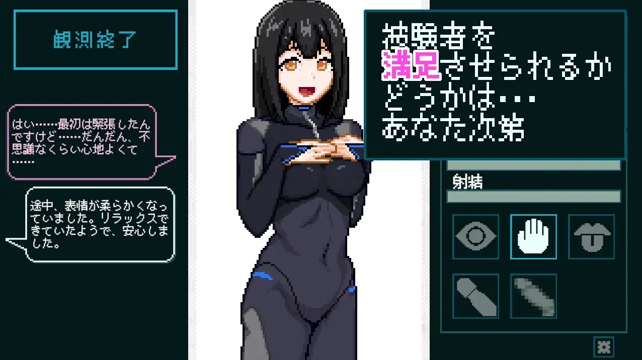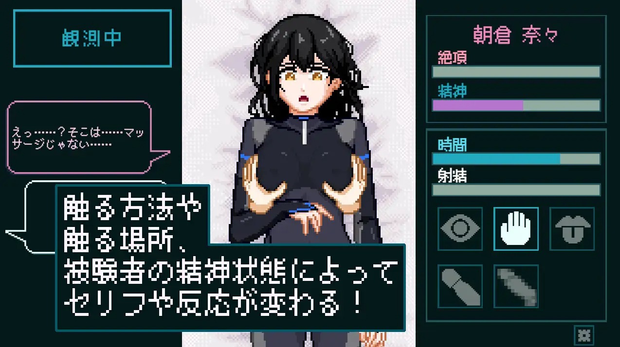 だが、装着したVRスーツが伝える感触はあまりにもリアルで、次第に現実と仮想の区別を失っていく――。プレイヤーは技術スタッフとして、刺激の強さやタイミングを操作し、奈々の反応を観察する立場。