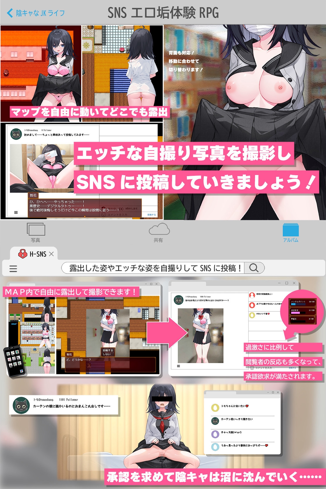 そうしたら、下心丸出しの男たちが集って褒め称えてくれて投げ銭までしてくれた。陰キャ故の臆病さで警戒はするものの、肉欲をもてあましながら承認欲求に飢えていた智花は、楽と快楽に流されてどんどん過激な写真を投稿していく事になるのだった……。●Hシーンのウリ