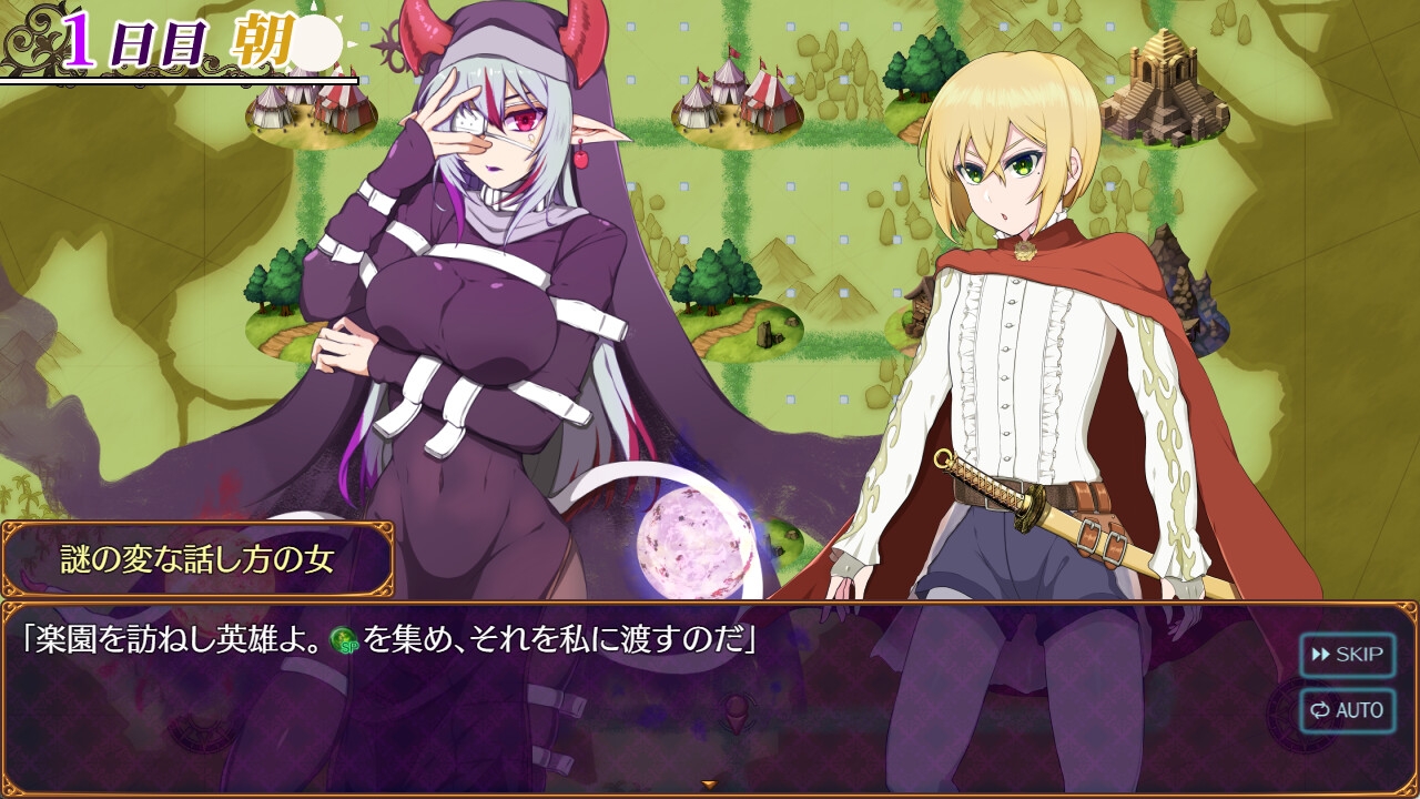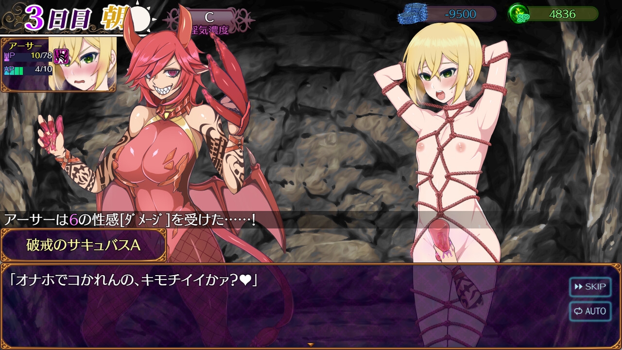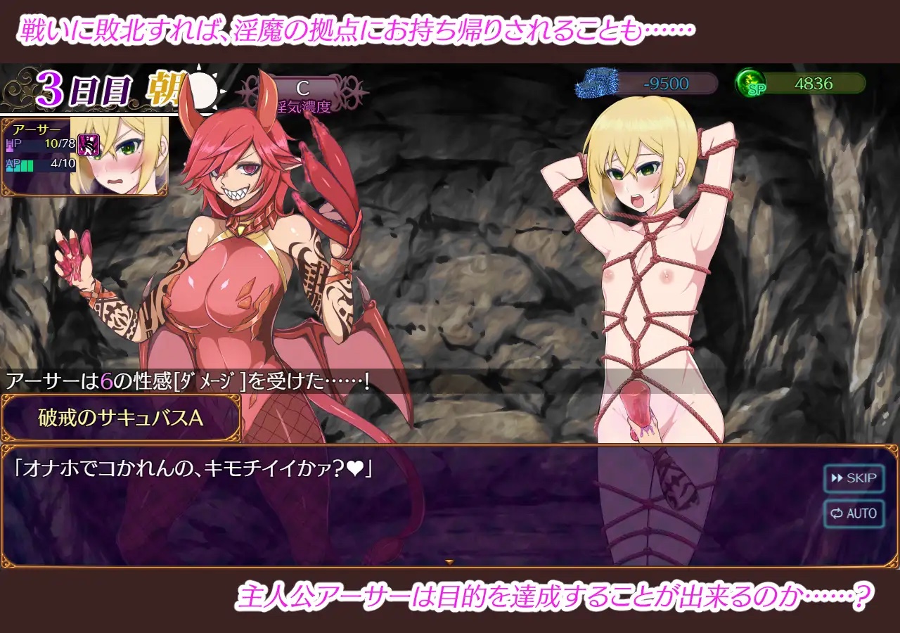 ☆若き美男子の主人公「アーサー」を操作し、様々な種族のサキュバスたちが蠢くダンジョン「楽園島(ラクエントウ)」を冒険するゲームです。
